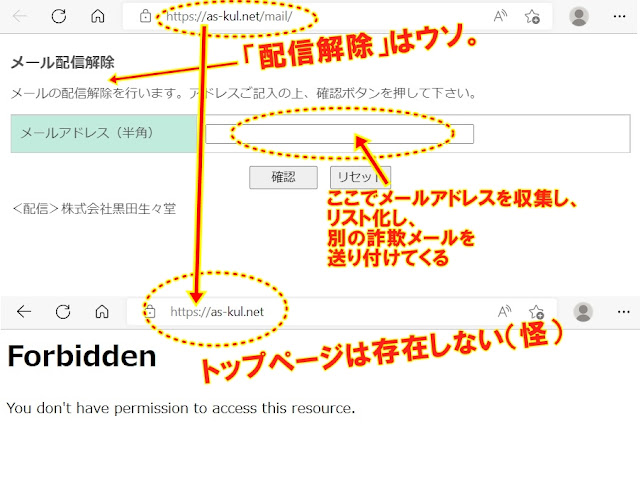 この「配信停止」の箇所の目的は、「配信解除」を装って、個人情報(メールアドレス)を書き込ませるフォームです。この「配信解除を装ったフォーム」で収集したメールアドレスがリストとして売買され、また新たに別の詐欺メールを送り続けます。